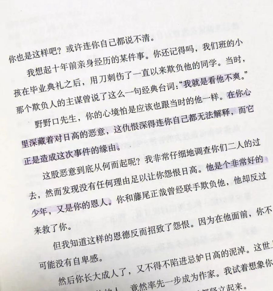 实际上,犯罪嫌疑人野野口修的这种心理有点破罐子破摔的味道,反正自己也被抓了,自己也病了,不如破釜沉舟。他的杀人动机并不是很多读者认为的那句“我看他不爽”,而真实动机更为复杂,说到底就是怀有“嫉妒之心”。野野口修与作家日高邦彦曾经是很好的朋友,都想做一个作家,但当日高邦彦取得文学上的成就时,野野口修就开始嫉妒了。这是常人都有的心理,但嫉妒的程度会因人而异。有的人仅仅止于嫉妒,心里默默难受一下就过去了,有的人嫉妒之心却会长久持续,野野口修就是这种人。当日高邦彦的文学成就越来越大时,野野口修的嫉妒与恨意就愈加膨胀,最后做出了杀人并窃取日高邦彦成就的行为。日高不求回报的善和野野口修心胸狭隘的恶无形之中形成了鲜明对比,由此展现出人性善恶的因果关系。人固然有善恶的分别,但如果要让人直面犯罪嫌疑人这种“恶”,令读者震惊。《恶意》将这种恶通过文学的形式放大,并展现给读者,引起读者的思考。
