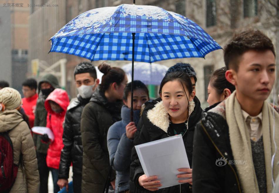 今天凌晨开始,白雪降临京城。上午8点,在位于南锣鼓巷地区的中央戏剧学院门前,地面已经覆上了洁白的一层。等待入场的考生已经排起了队, 他们中有的人为了让一会儿的表演更加精彩,忍着寒冷的风雪换上了轻薄拖地的礼服,外面裹着羽绒服还冻得瑟瑟发抖。还有的考生在不断的默念着台词。